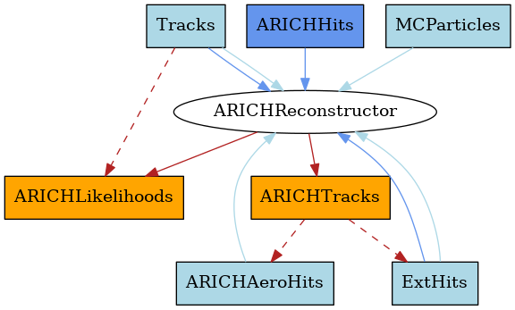 This module takes either reconstructed tracks from tracking or GEANT4 simulated tracks as input. For every track, the value of ARICH likelihood function is calculated (by calling likelihood2 function), which gives the probability that a track was made by a certain particle. This information is stored in ARICHLikelihood object. Also, number of theoretically expected photons per hypothesis (five in all) and number of detected photons are added to this object. Finally, the module stores the relations between the track candidate, extrapolated track and calculated ARICH likelihood.