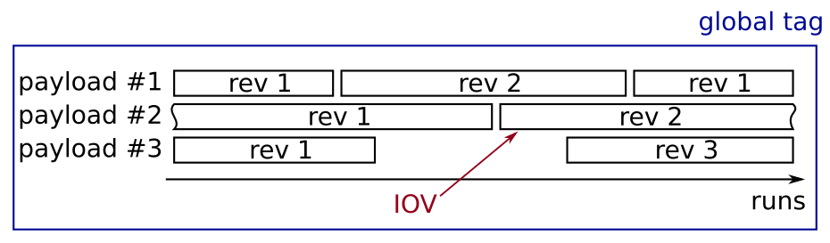 Fig. 5.2 Schematic display of a globaltag: Different payloads with different revisions are valid for a certain set of runs.#
