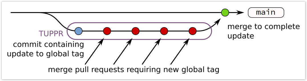 The globaltag manager for software development will create a new main globaltag and a merge request to change the software to use this globaltag, the “Tag Update Procedure Pull Request” (TUPPR). This merge request is like a box to contain a set of changes to the globaltag in an airtight way to make sure they all stay fresh and don’t break other branches until the change to the globaltag is actually added to main.