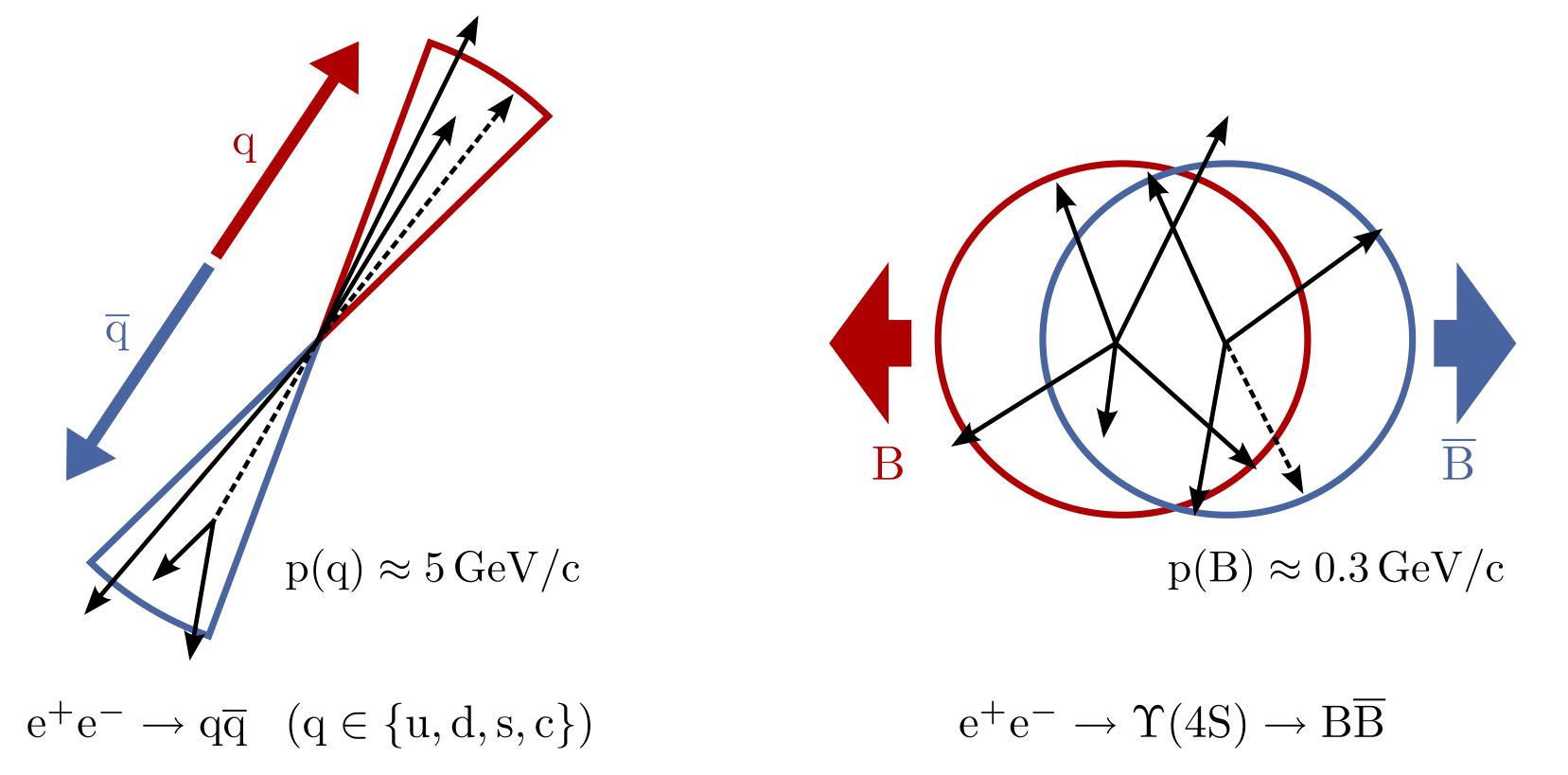 The continuum particles are strongly collimated due to the large available momentum for the decay to light hadrons. In contrast, the particles from the BB event are uniformly distributed.