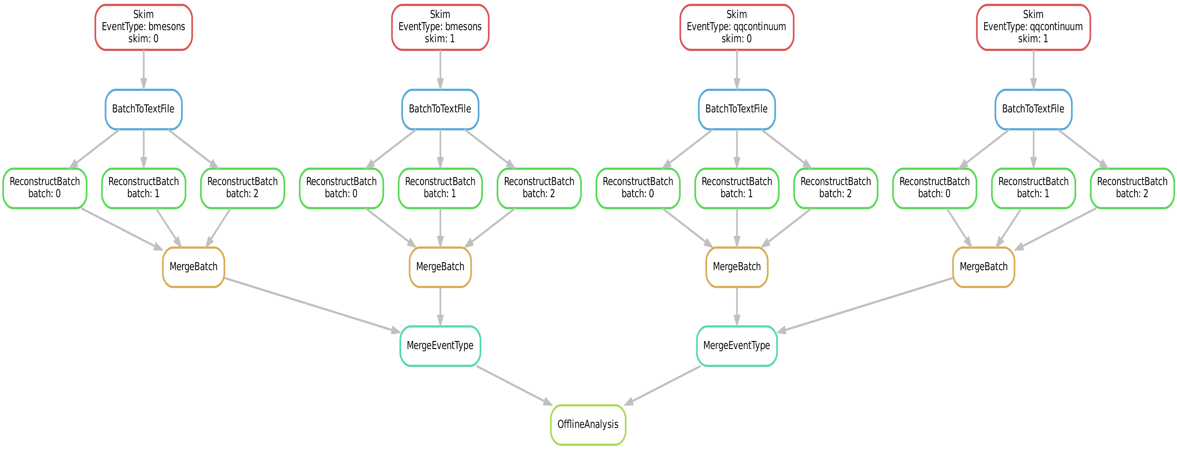 Again, we submit four skims (two for B mesons and two for quark-antiquark continuum) to the grid, which are each reconstructed in three batches on the KEKcc batch system. The reconstructed batches are merged and finally we fill some histograms in the offline analysis.
