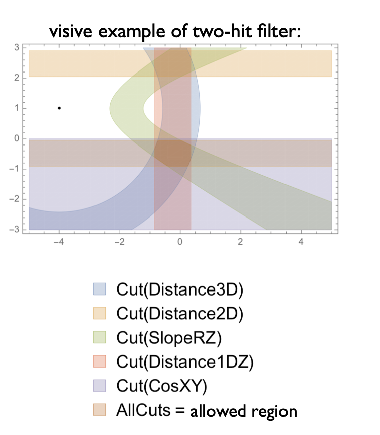 The allowed range for each filter is learned from simulation, filling the distribution of the variable during the training and defining threshold as max and min of the distribution (or 0.1% and 99.9% quantile?). Using the friendship relations and the filters, segments connecting two, three or four SpacePoints are built. At this stage a single SpacePoint can be shared by more than one segment and we are ready to build track candidates that are identified and collected by a Cellular Automaton.