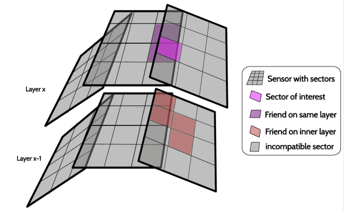 The goal extract track patterns from a huge number of possible combinations of space points (3D hits) in the 4 SVD layers. The logic behind the reduction of the number of combinations is the following: divide the sensors into sectors (NxM) combine SpacePoints belonging to friend-sectors only, two sectors are friend if they are directly connected by a track reject background SpacePoints using dedicated filters