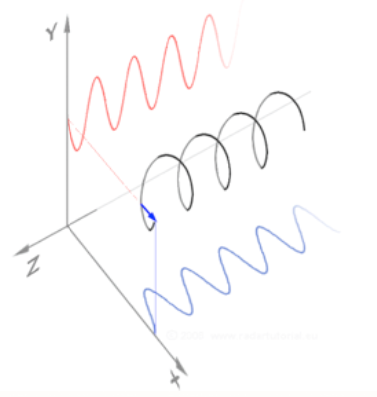 Fig. 23.1 A perfect helix (black), and its projections on the \(xz\) (blue) and \(yz\) (red) planes. The B field is along \(z\).#