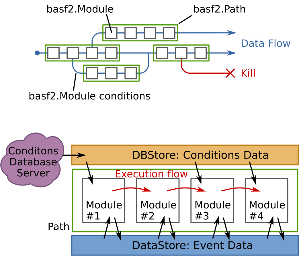 Fig. 4.1 Schematic view of the processing flow in the Belle II Software¶