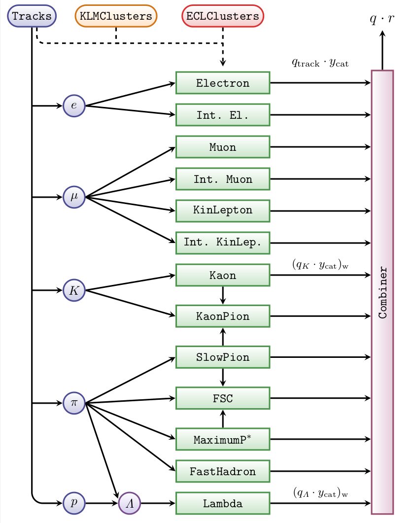 In the first step a dedicated ParticleList is created for each type of reconstructed tracks (electrons, muons, Kaons, pions and protons). The particles in each list correspond to the whole set of Rest Of Event (ROE) tracks fitted with a specific mass hypothesis. The mass hypothesis of each ParticleList corresponds to the searched flavor signature, e.g. “K+:KaonROE” is created for the categories using the information of kaons. Several flavor tagging input variables are calculated for each track. In these calculations the ECL and KLM Clusters are implicitly involved. The variables are taked as inputs for a category specific multivariate method.