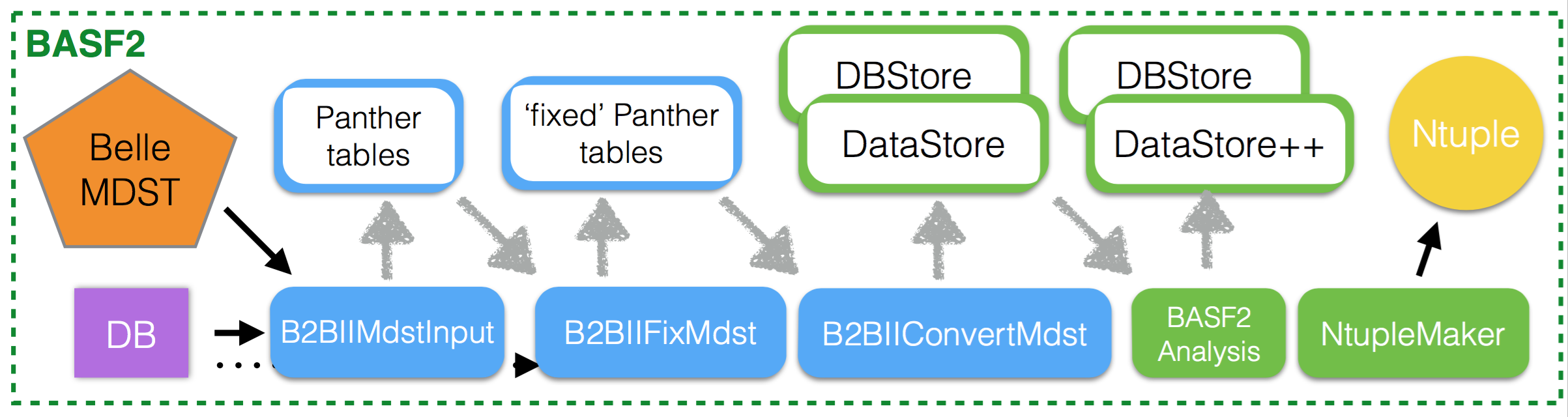 The b2bii convert reads and converts Belle MDST within basf2, and the converted data can be then analysed within the same job, without any intermediate steps.