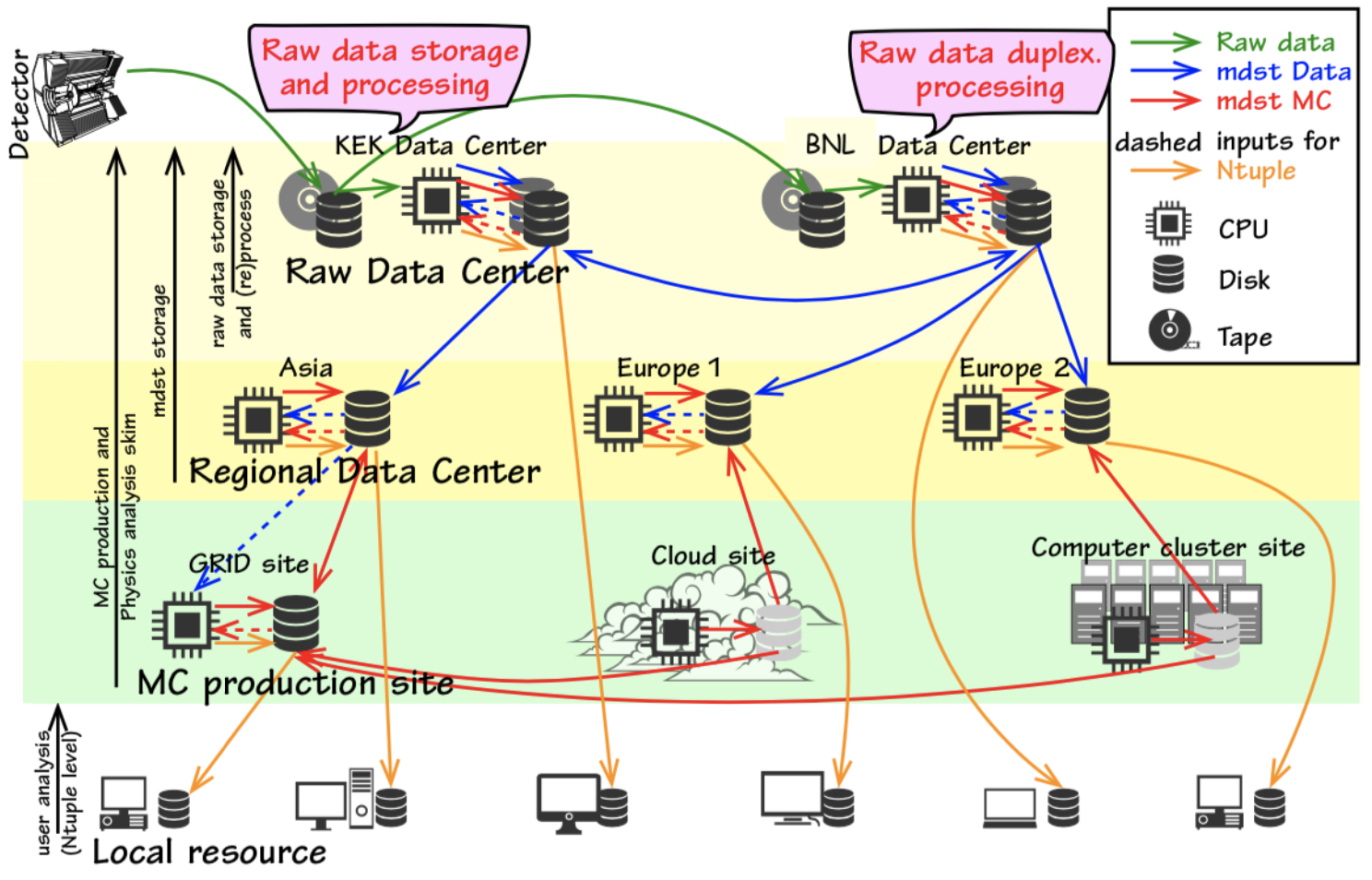 Fig. 25.31 The Belle II distributed computing model. Two copies of the raw data are stored and reprocessed at the raw data centers, in order to produce mdst files.¶