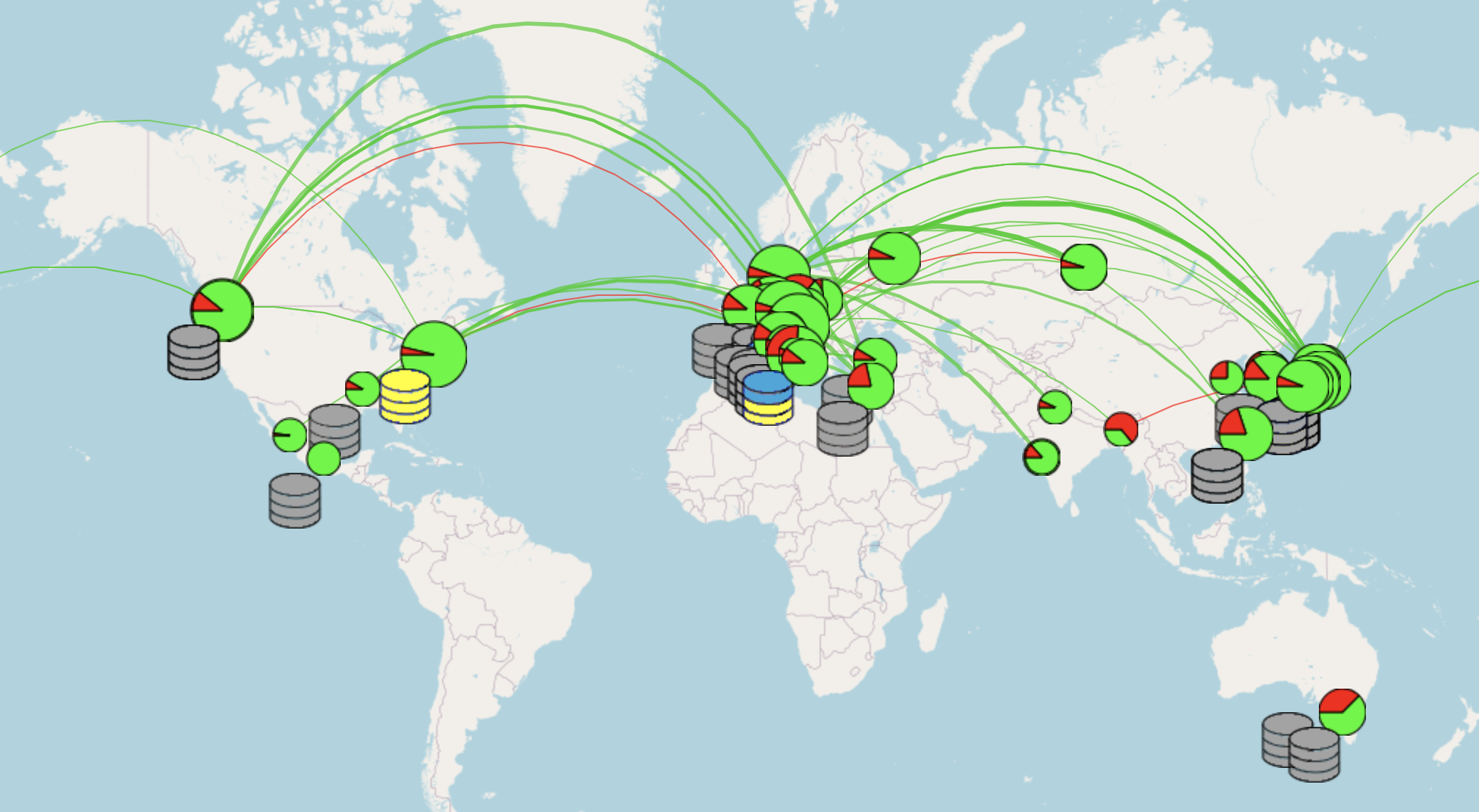 Fig. 25.30 Snapshot of the Belle II grid, composed by 60 computing sites around the world.¶